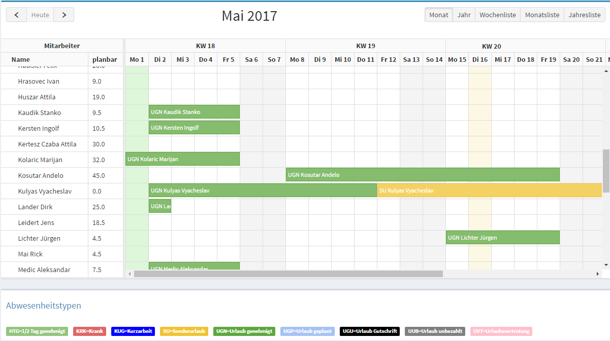 Im Urlaubsplaner bereits vorhande Abwesenheitstypen